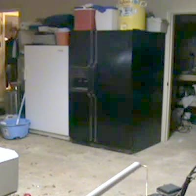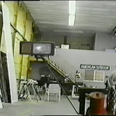 3 men walk into a garage and scream and jump back when a fake rat rolls out towards them. Practical joke. Man holds gun.