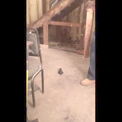 A man doesn't see a fake rat on the floor even when he kicks it. As soon as he notices it he yells and runs out of the room.