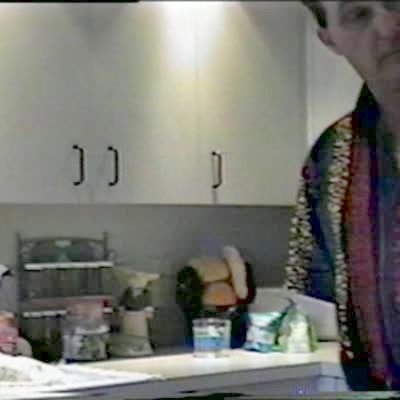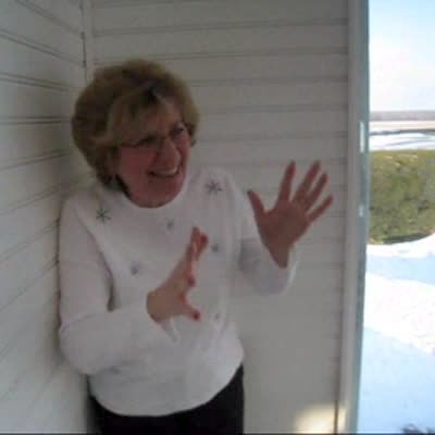 Senior woman finds a Christmas present while playing "warmer / colder" with her family. Fake rat jumps out from under the present and scares her. Practical joke.