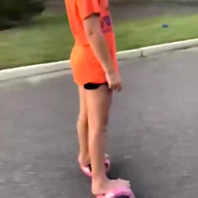 A young girl rides a hoverboard on a street, and she leans forward and falls off.