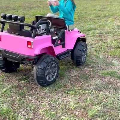 A tot girl uses a remote control to drive a toy car in reverse in a yard while she sits on the hood. Then she turns around and drives the car forward while she faces backwards. She crashes into a wall in the yard and falls off the hood.