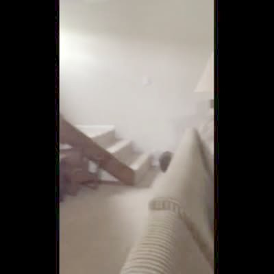 A man follows two dogs down some wooden steps when the stairway collapses and he falls through them. He recovers, stands up and walks away. Security footage.