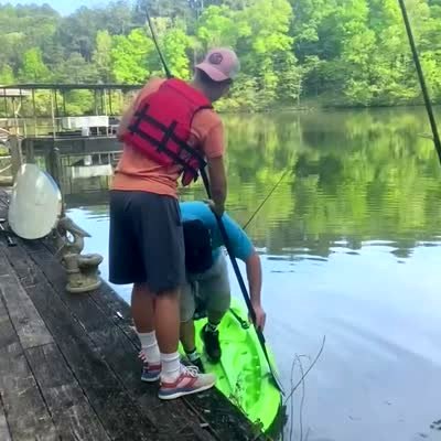A man tries to climb into a kayak on a lake and falls forward and hits his head on the dock and falls in the water.