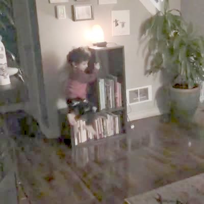A young girl passes gas when she climbs a cabinet during an Easter egg hunt with a tot girl in the living room.