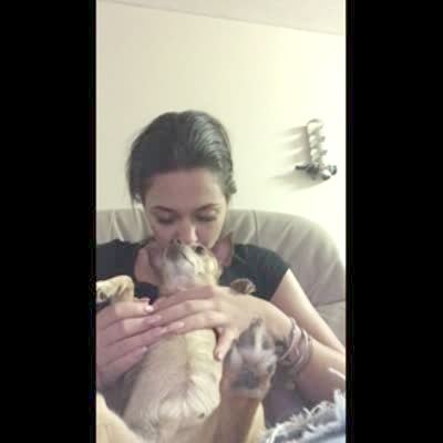 A dog looks at the camera while she lies on her back in a woman's lap and farts.