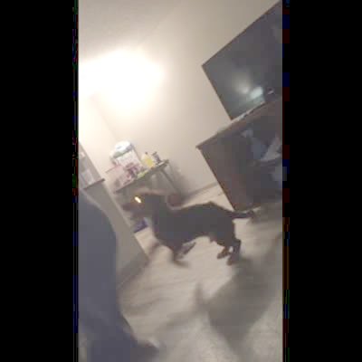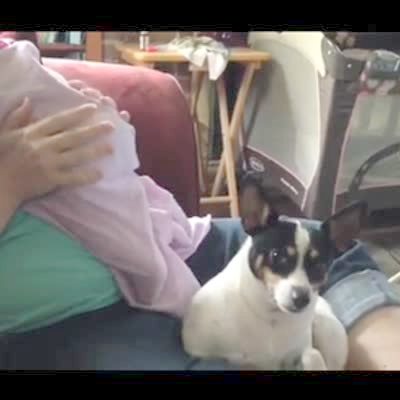 The person behind the camera farts and a woman and dog look at her in concern in the living room.