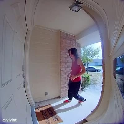 A woman steps outside to a front porch to pass gas, and then realizes there is a ring camera, and laughs. Security Footage