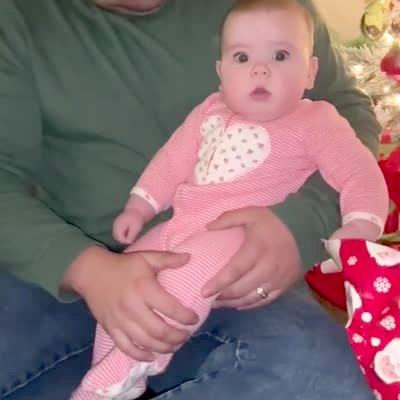 A woman wishes a baby girl a merry Christmas and the baby farts loudly in a living room.
