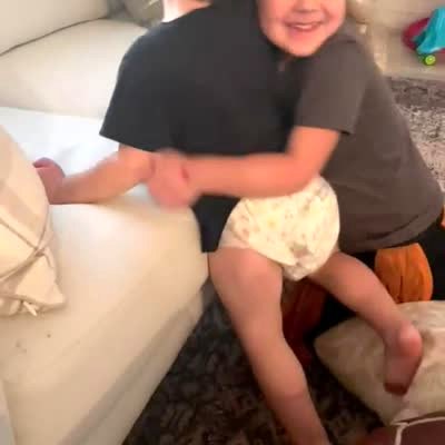 Tot boy and girl siblings wrestle while in a living room, until the boy farts and the girl laughs.