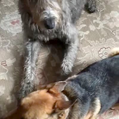A woman asks two dogs that lie on the floor, "Which one of you farted?" One dog puts his paw on the other dog's back.