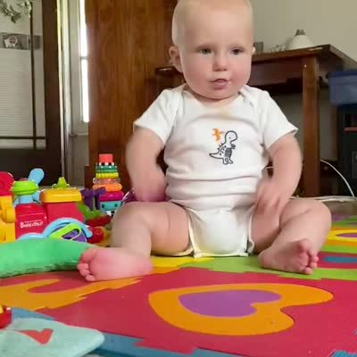 A young girl is prompted by her to say "more" in sign language. She does the sign, but then farts, makes a disgusted face and says "ew."