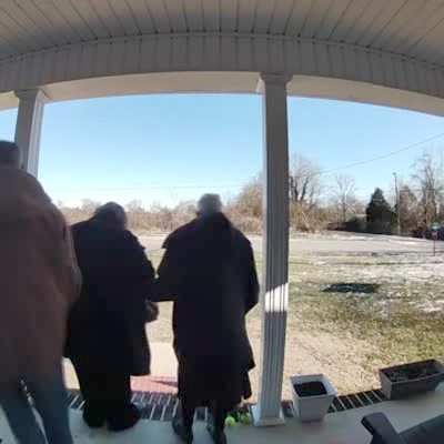 A man and a woman and a senior woman walk outside and the man hops off the porch and farts and the woman laughs and falls off the steps. Security footage.