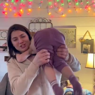 A woman holds a tot girl on her shoulder and moves her legs in and out and makes a cocking sound and the girl farts and they laugh in the living-room.