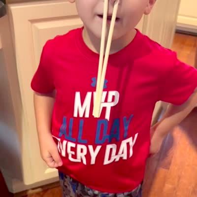 A young boy puts unseparated chop sticks to pinch his nose so that he doesn't have to "smell any farts from me"