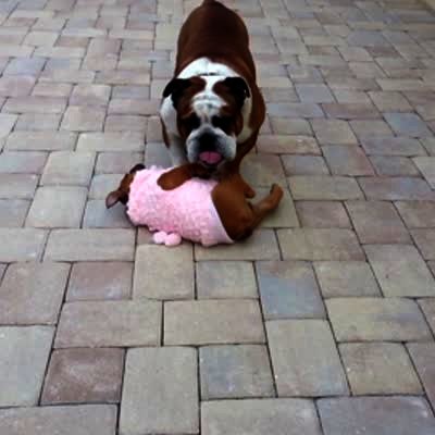 A bulldog dog plays with a bulldog puppy in a pink sweater outside. Puppy falls over and can't get himself back up because he's too fat. Stuck