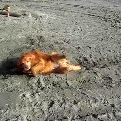 Big fat brown dog is stuck in the sand & has a hard time trying to get up. Beach.