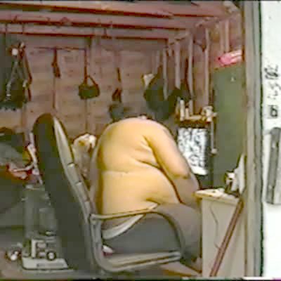 A man snores loudly in chair in shed, his head bobs all over the place.