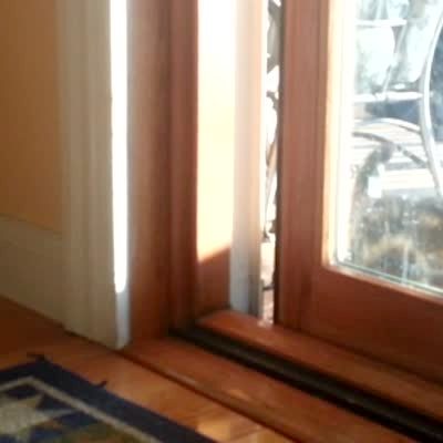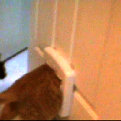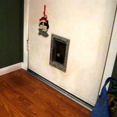 Fat brown cat gets stuck trying to go through kitty door. It pushes the door open while trying and finally gets through.