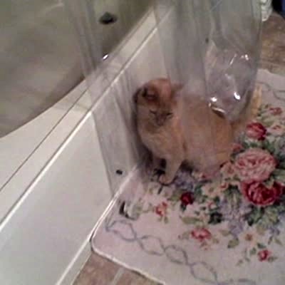 Fat cat hides behind clear plastic curtain. Off-camera person quietly puts their finger on the curtain & the cat jumps at it.