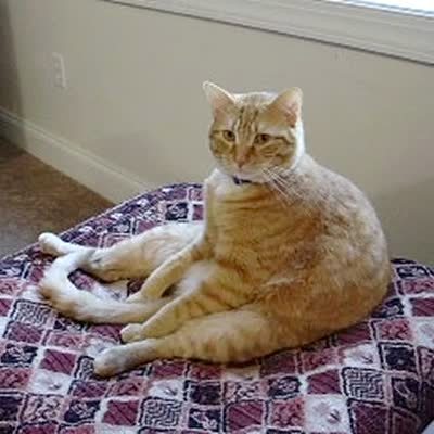 Fat brown cat sits up like a human and stares at woman behind the camera. Funny visual.