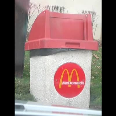 Fat squirrel exits a McDonald's trash can eating a French Fry.