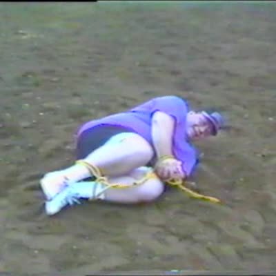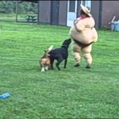 Woman in a fat suit and bikini gets chased around the yard by dogs.