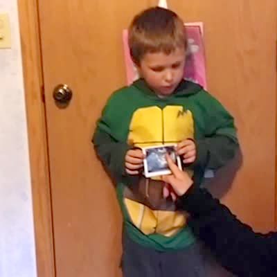A boy holds a sonogram picture of his baby sibling on the way but doesn't know what it is. His mom points out the baby's head and body and says that it's in her stomach. The boy is shocked and says "I knew it! Because you were fat. That's why you were fat."