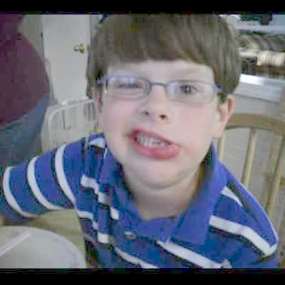 A boy laughs at the dinner table with a fat lip at home after going to the dentist. He has bitten his lip and cannot feel it.