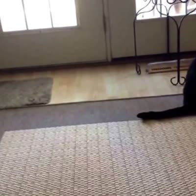 A fat cat tries to squeeze through cat door. Finally gets in. Funny visual