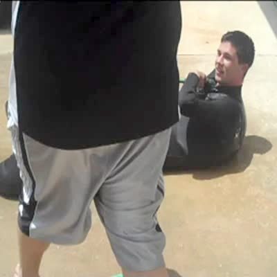 Man tries to rinse out wetsuit while still wearing it in driveway, suit fills up with water, makes man look fat.