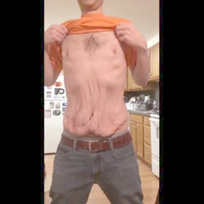 A man jumps in slow motion with flapping skin on his stomach after he's lost weight.