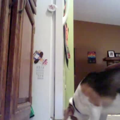 A fat dog opens fridge and tries to take food out. Gets caught and runs away. Beagle. Start at 0:35.