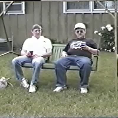 Two men sit on a swing bench, drinking. The seat breaks and the men both fall.