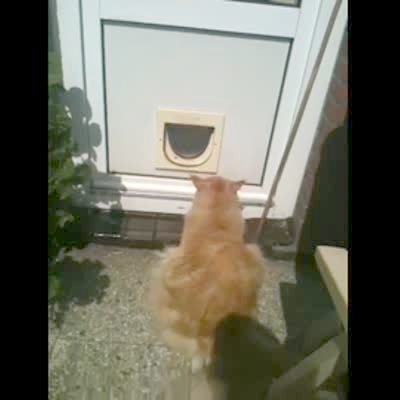 A fat orange cat chases a black cat through a cat door and gets stuck indoors.