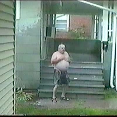 A senior man takes a shower in front yard under the runoff rain water from the roof of his house. Lathers with soap. Man sings "bathin' in the rain." Dances up and down steps.
