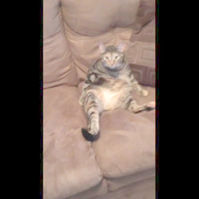 A heavy cat sits on a sofa like a person as the man behind camera teases her.