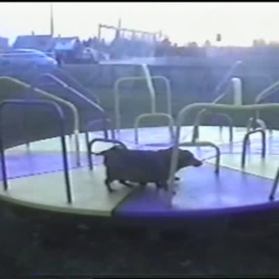 2 fat dogs on merry go round walk around. Looks like they are on a treadmill.