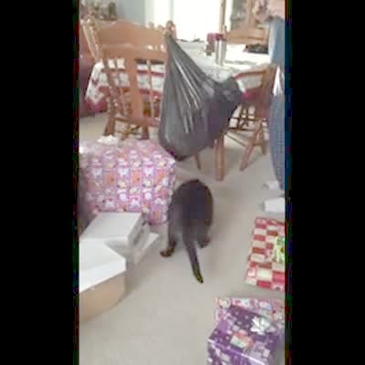 A black cat gets his head stuck in a gift bag on Christmas and walks backwards until he's able to get it off.