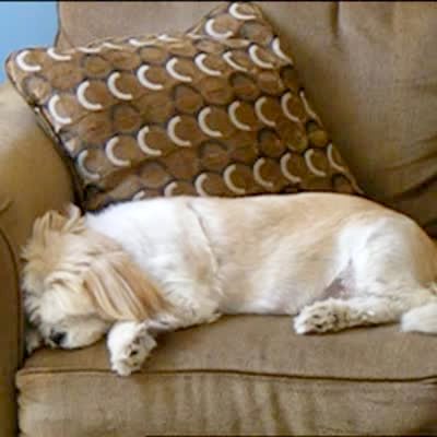 A fat chihuahua dog repeatedly tries to jump up on a man's lap while he's in a reclining chair but can't until the end.