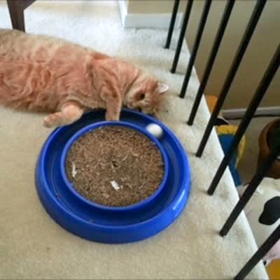 A fat cat lays by his toy and lazily pushes a ball in circles.
