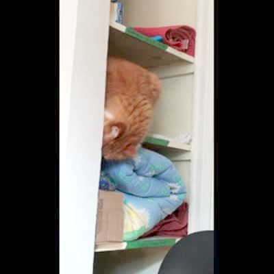A large cat climbs from a closet shelf to the one above him but can't grip the higher shelf, falls on the shelf below, then falls down.