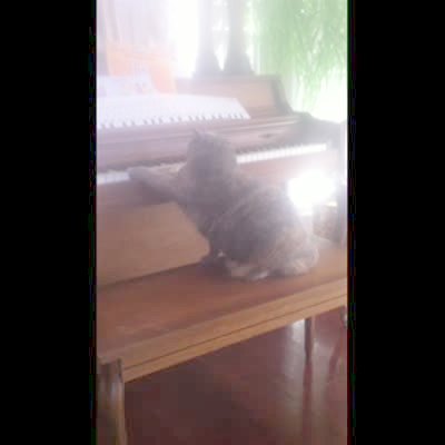 A fat cat sits indoors on a piano bench and plays the piano - first with one paw, then two.