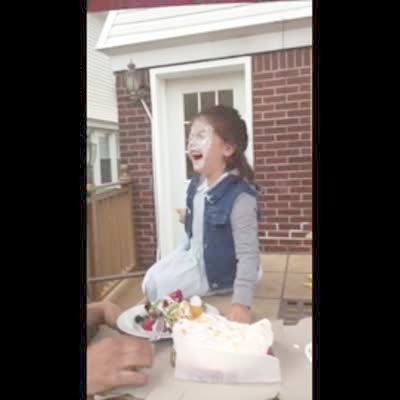 A young boy blows up two party favors in his nostrils.