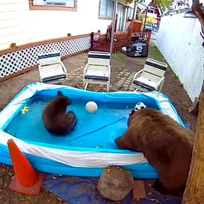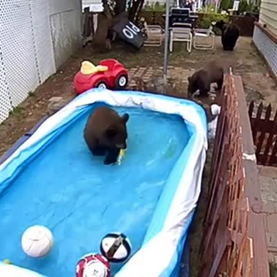 Two bears enter an inflatable pool in a yard, then they wrestle each other and one bear falls out of the pool. Security camera footage.
