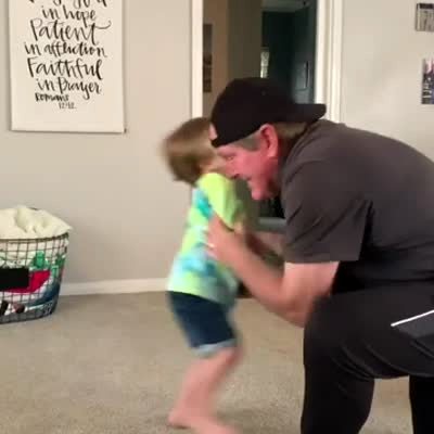 A tot boy and his grandfather play fight in a living room as they pretend to punch each other. The man tells the boy to punch his stomach, the boy does then kicks him in the groin and he falls over.