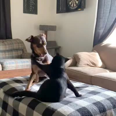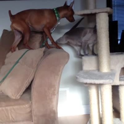 A Miniature Pin dog and a Siamese cat have an animated fight on the living room couch.