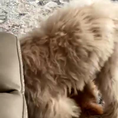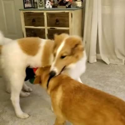 A Chihuahua dog reaches between a Doodle puppy dogs legs while they fight over a toy and waddle around the living room.