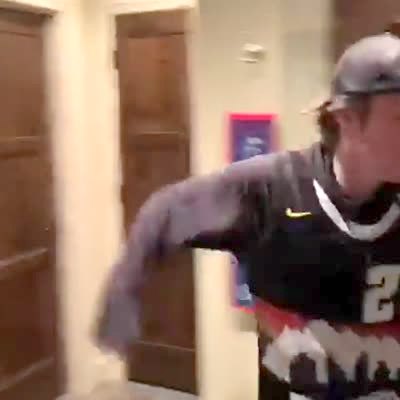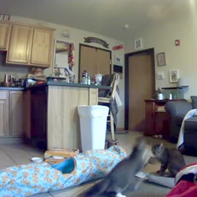 A tot boy has boxing gloves on and has an imaginary fight with someone on the deck. He says, "You want some pizza from me?" He probably means, "You wanna piece of me?" Security Camera Footage.