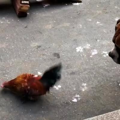 A boxer dog and a rooster bird bite each other as they fight over treats in a yard.