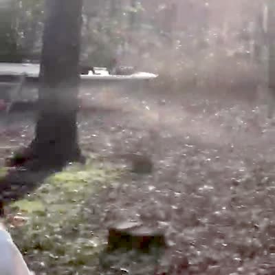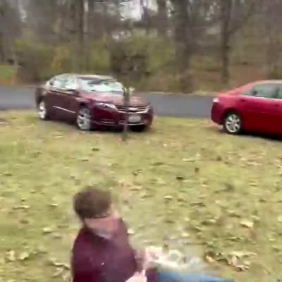 Two young girls and a young boy pose for a photo in front of a tree covered in snow in a yard. A man kicks the side of the tree and snow falls on the kids. TikTok video.